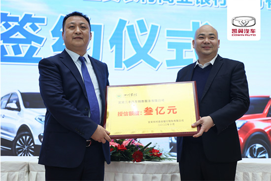 仪式现场,凯翼汽车有限公司副总经理刘宏伟和宜宾农商银行副行长曹华勇分别代表企银签署战略合作协议。在现场嘉宾的共同见证下,宜宾农商银行翠屏支行行长张建为宜宾三丰汽车销售服务有限公司进行了授牌,为宜宾三丰提供3亿元的授信,便于宜宾三丰更好地服务于宜宾用户。